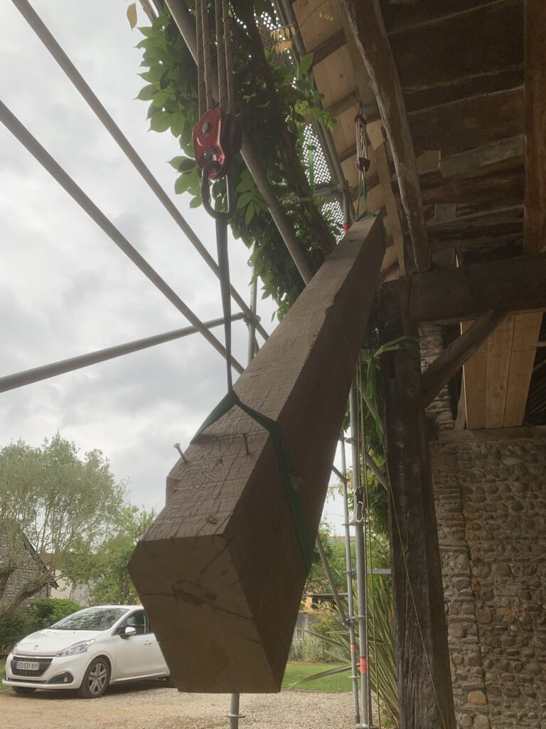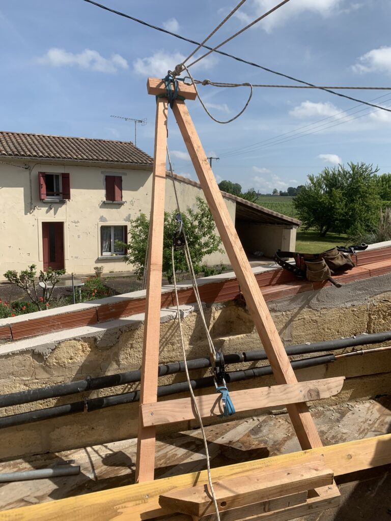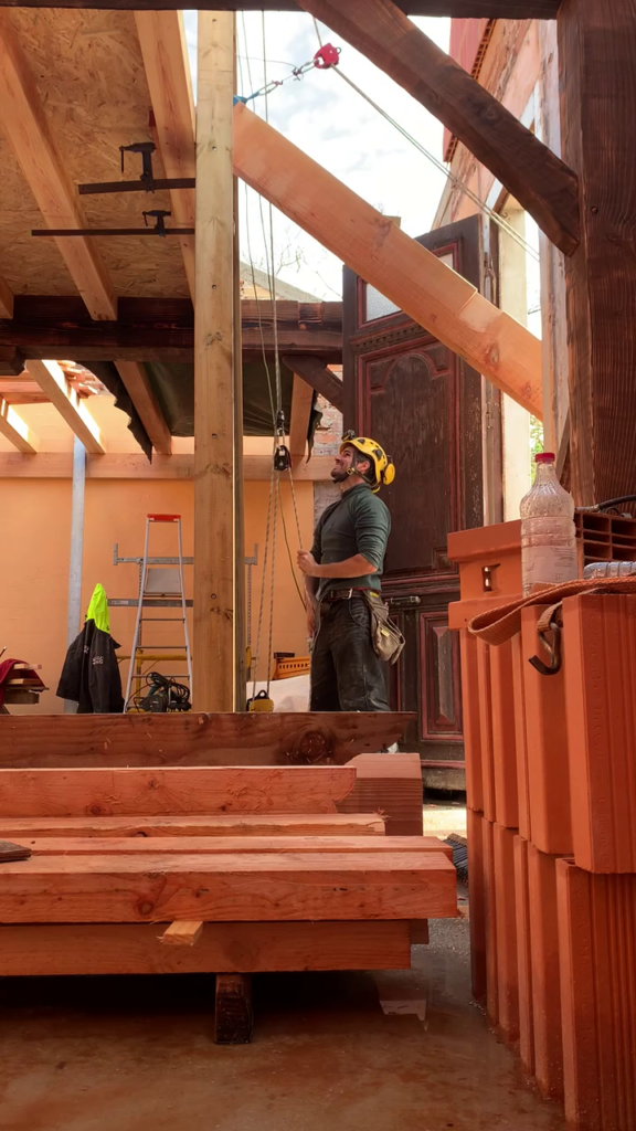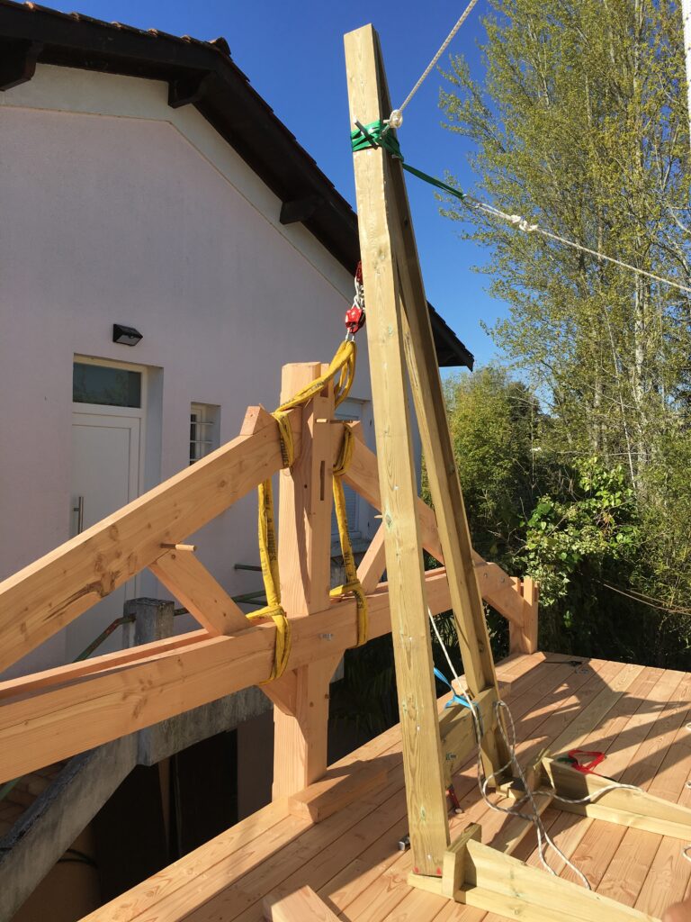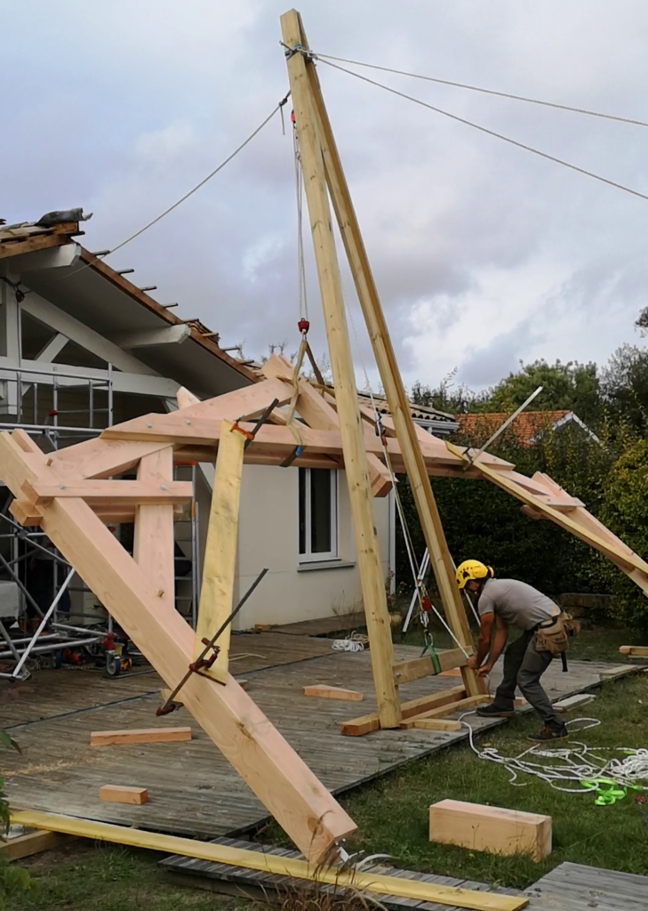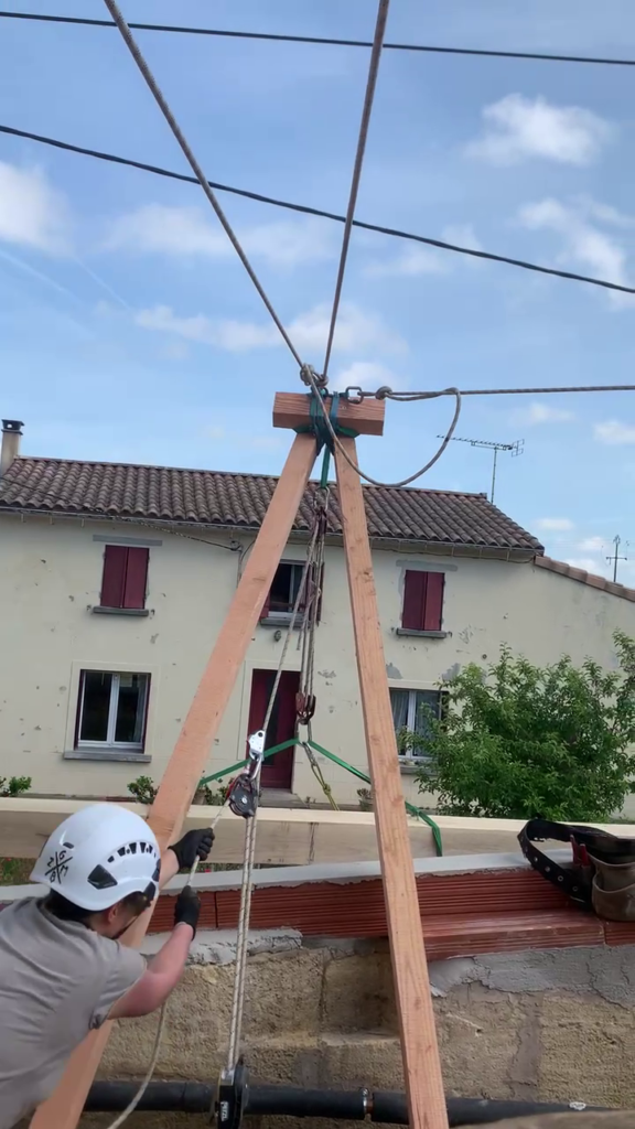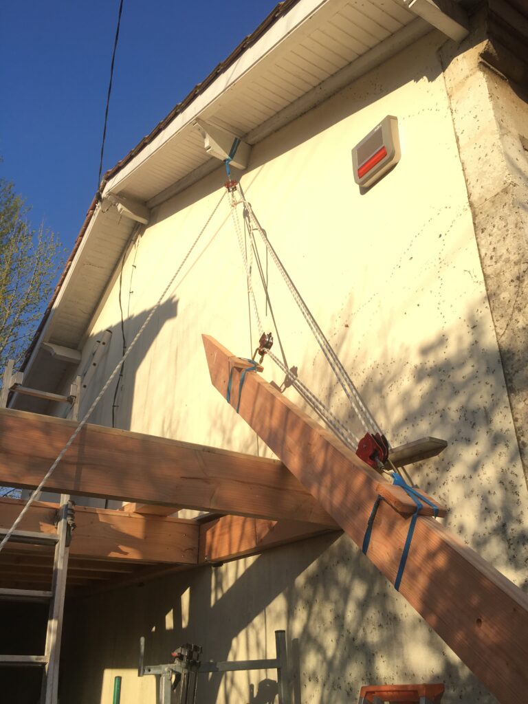 Pour faciliter la mise en place de structures de charpente plus lourdes, nous utilisons une technique de levage à la corde qui consiste à utiliser des mouflages équipés de poulies. Cette technique permet de démultiplier les efforts et de faciliter le levage de structures de charpente, tout en garantissant une grande précision dans la pose et sans l’utilisation d’engins de levage.