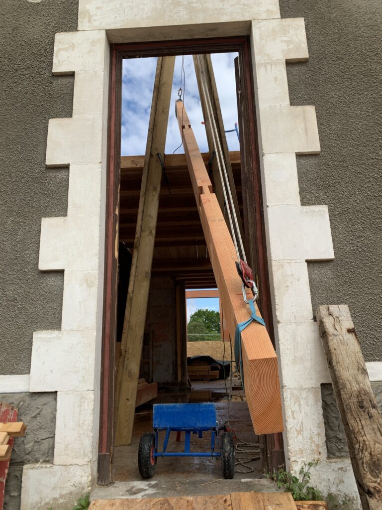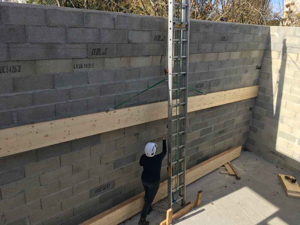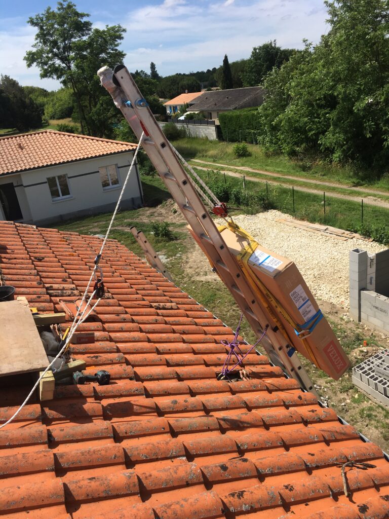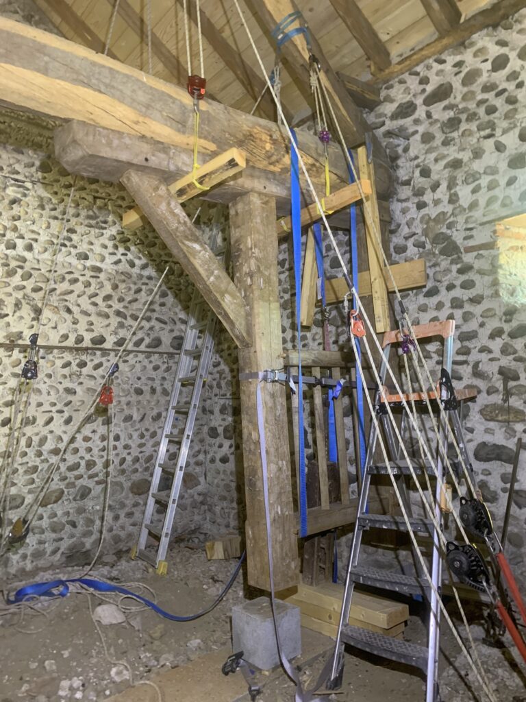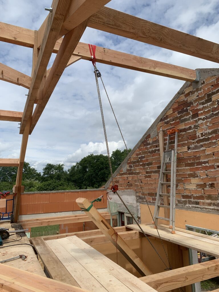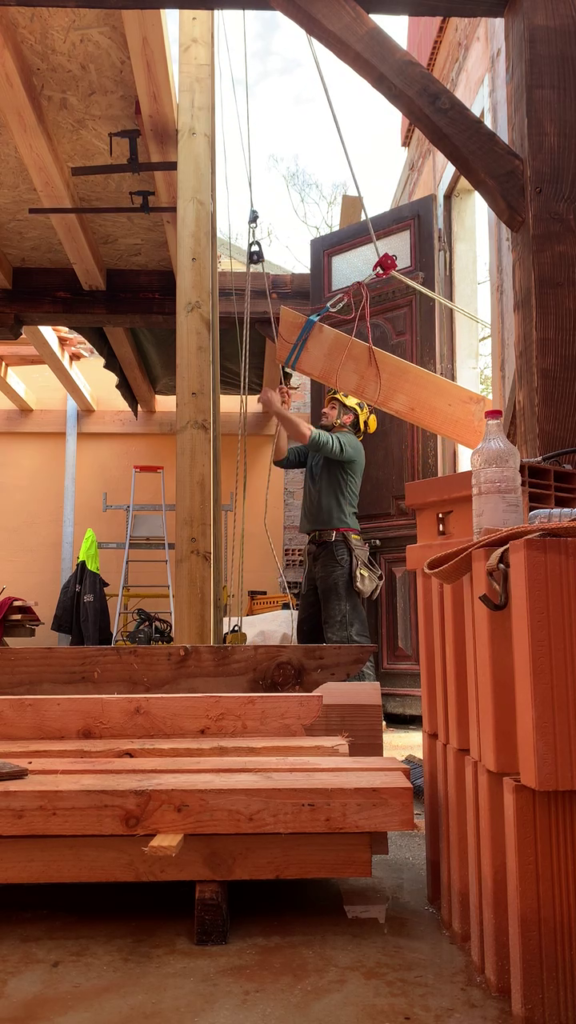 Pour faciliter la mise en place de structures de charpente plus lourdes, nous utilisons une technique de levage à la corde qui consiste à utiliser des mouflages équipés de poulies. Cette technique permet de démultiplier les efforts et de faciliter le levage de structures de charpente, tout en garantissant une grande précision dans la pose et sans l’utilisation d’engins de levage.