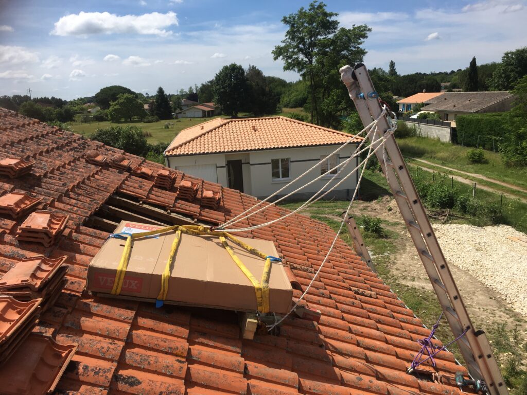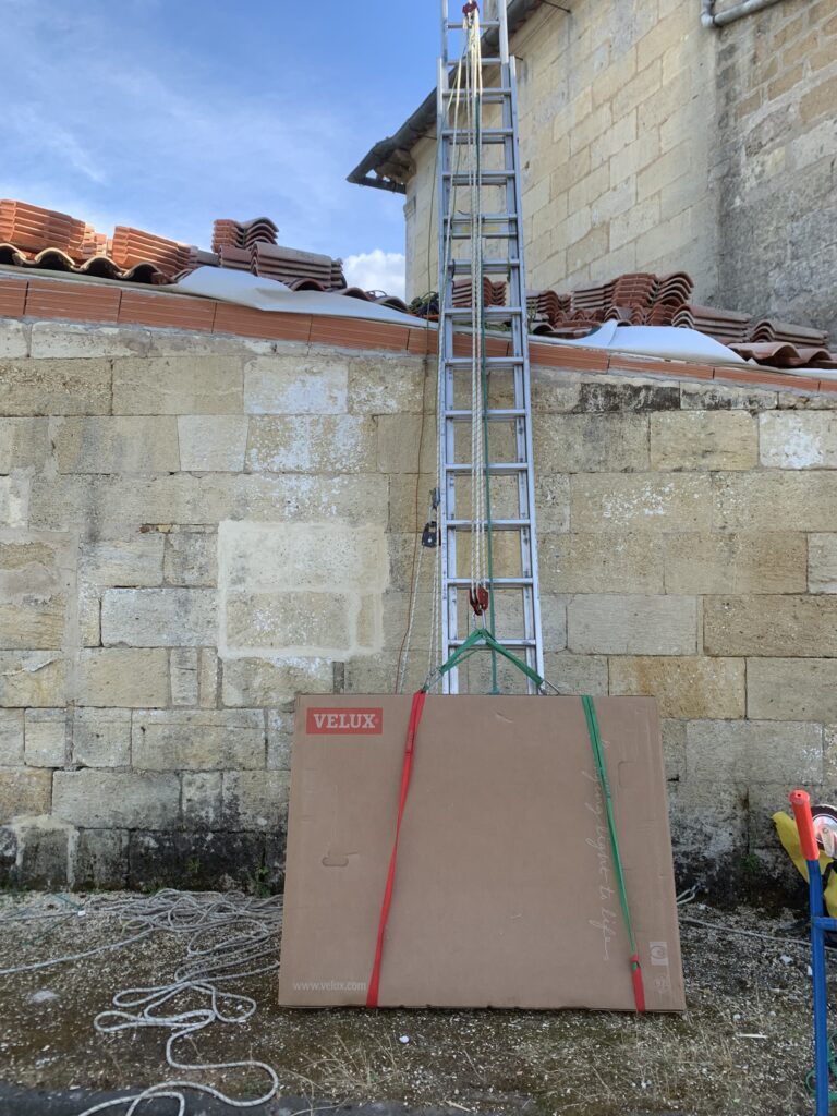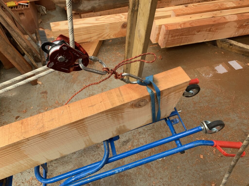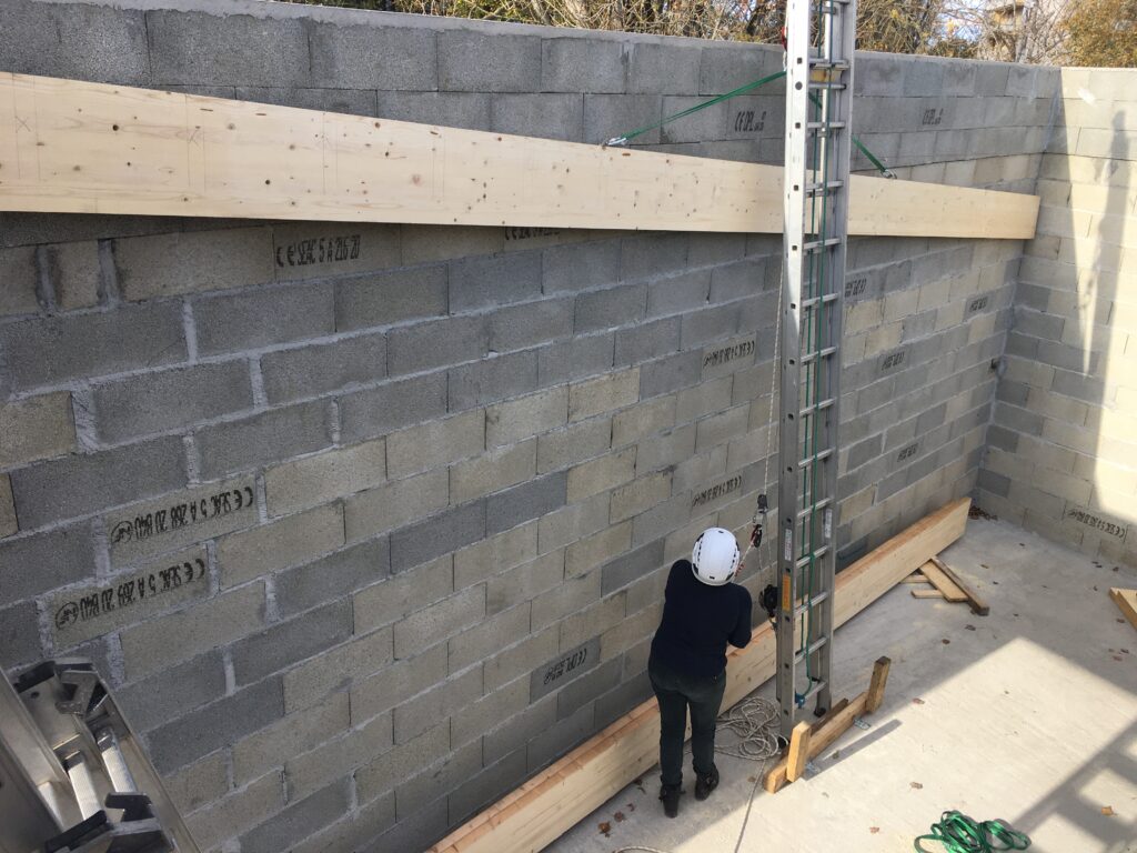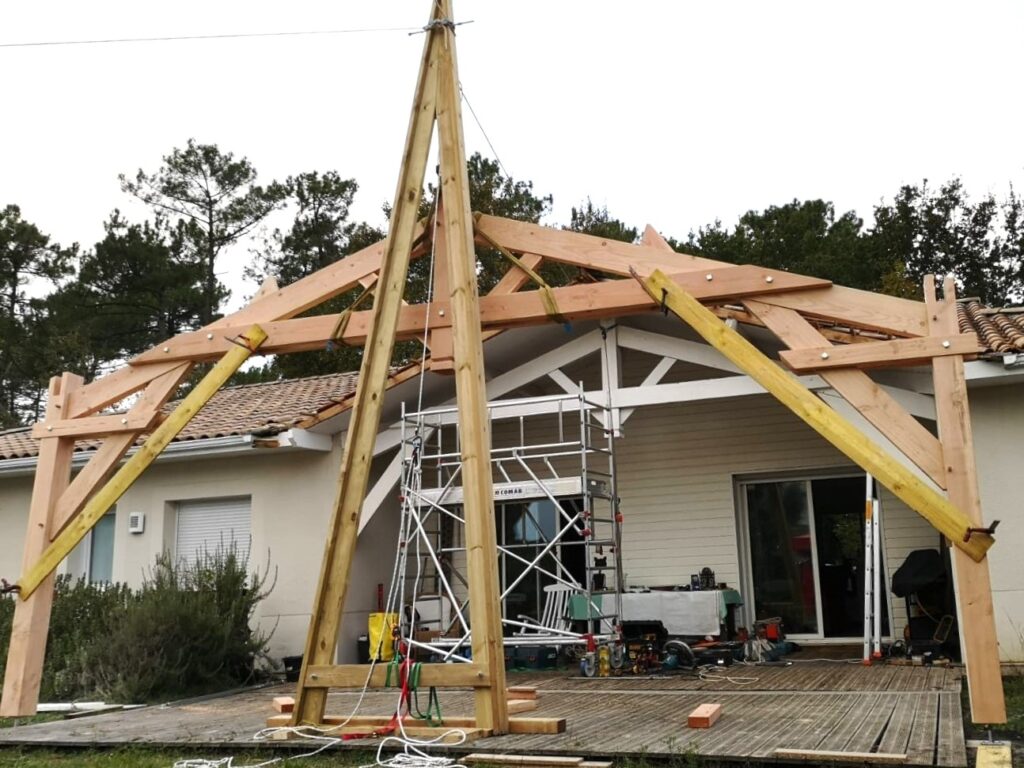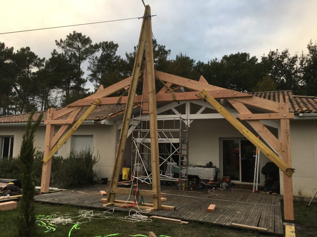 Pour faciliter la mise en place de structures de charpente plus lourdes, nous utilisons une technique de levage à la corde qui consiste à utiliser des mouflages équipés de poulies. Cette technique permet de démultiplier les efforts et de faciliter le levage de structures de charpente, tout en garantissant une grande précision dans la pose et sans l’utilisation d’engins de levage.