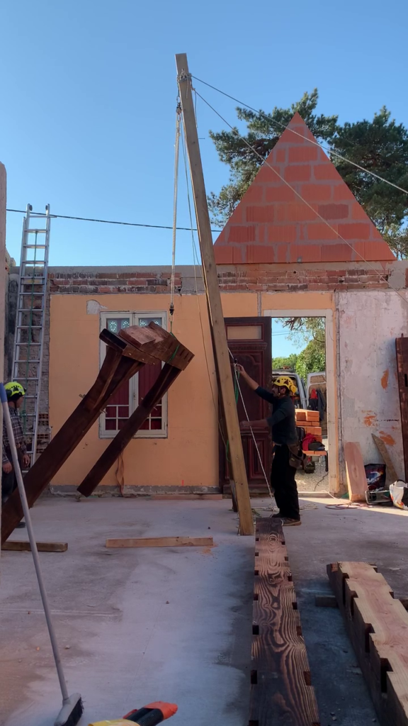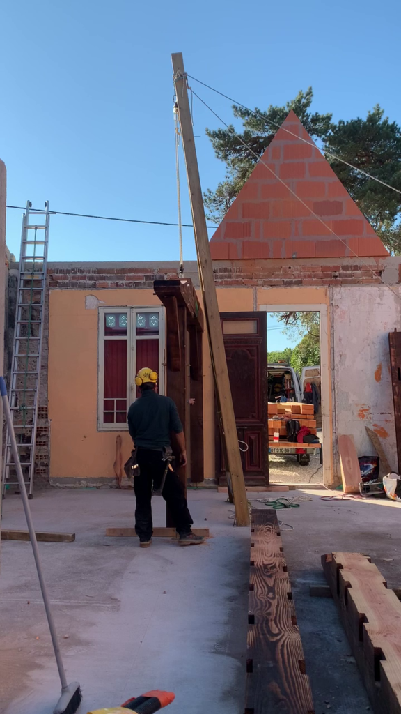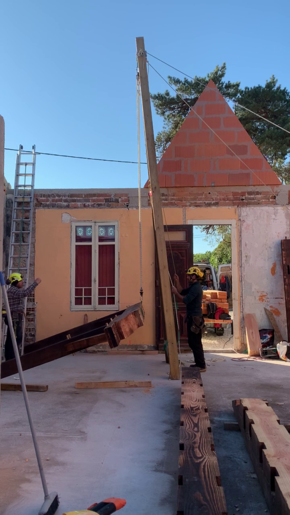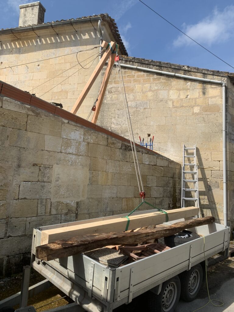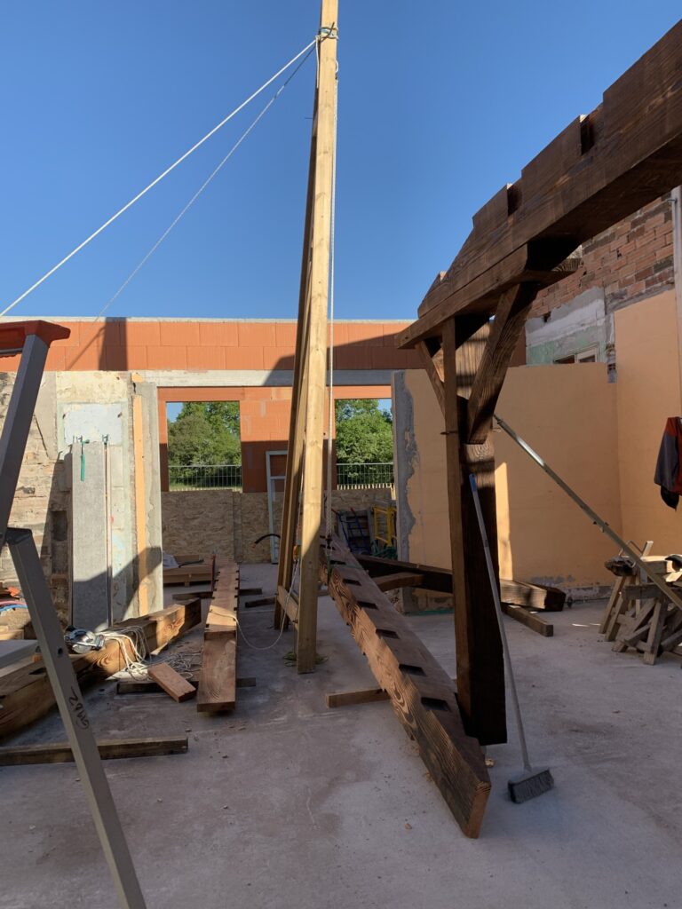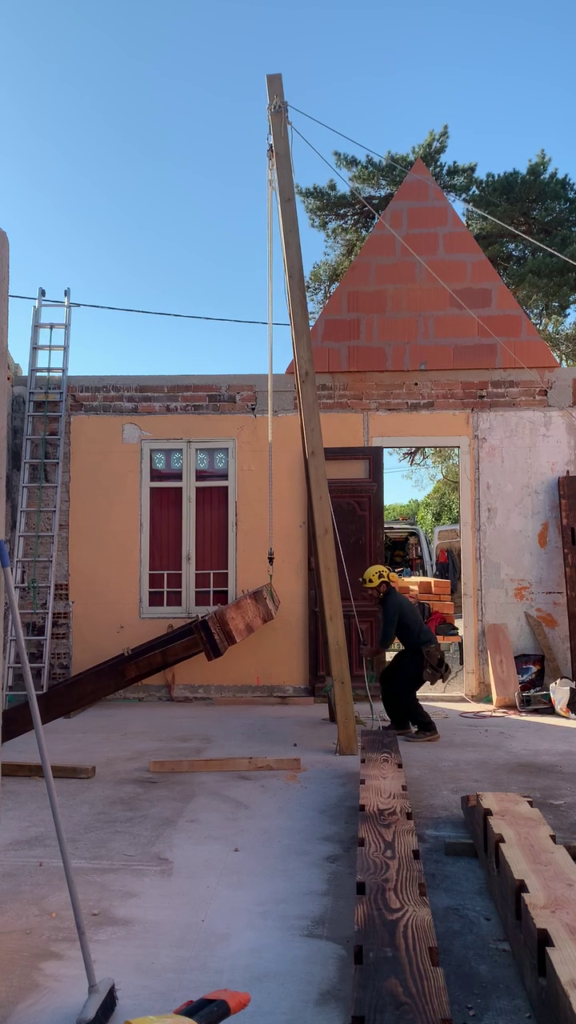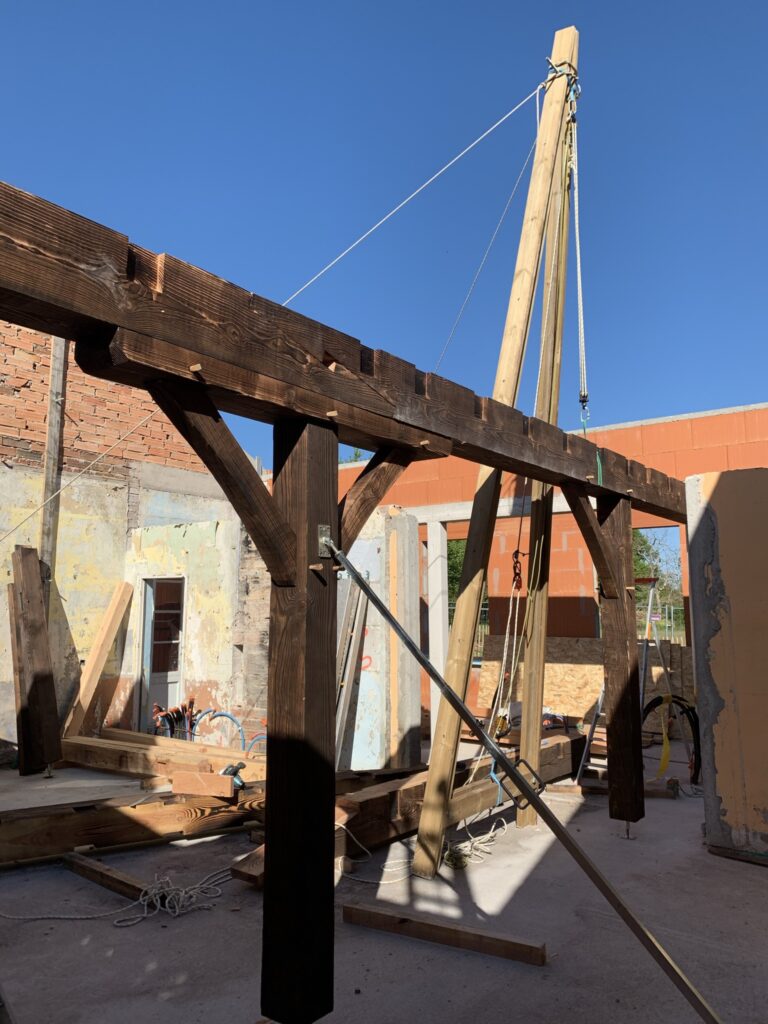 Pour faciliter la mise en place de structures de charpente plus lourdes, nous utilisons une technique de levage à la corde qui consiste à utiliser des mouflages équipés de poulies. Cette technique permet de démultiplier les efforts et de faciliter le levage de structures de charpente, tout en garantissant une grande précision dans la pose et sans l’utilisation d’engins de levage.